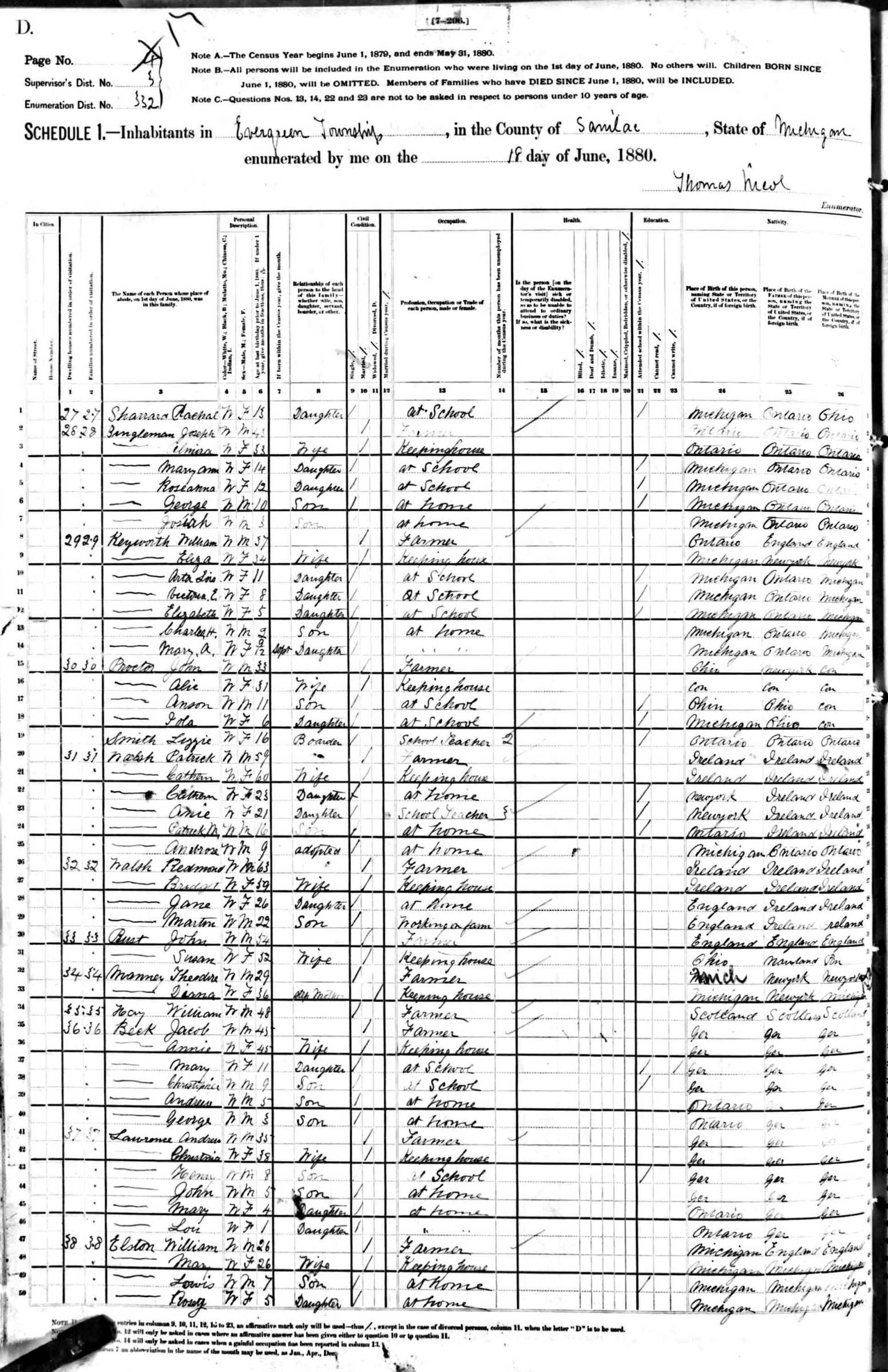 - U.S. Census 1880 show this household in Evergreen Twp., Sanilac Co., Mich.: