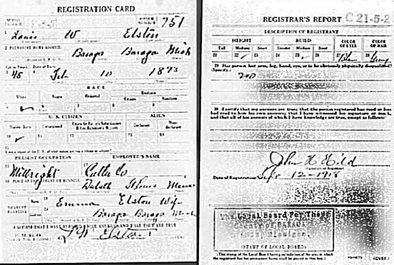 - First World War Draft Registration for Lewis Elston, residing in Baraga, Mich.