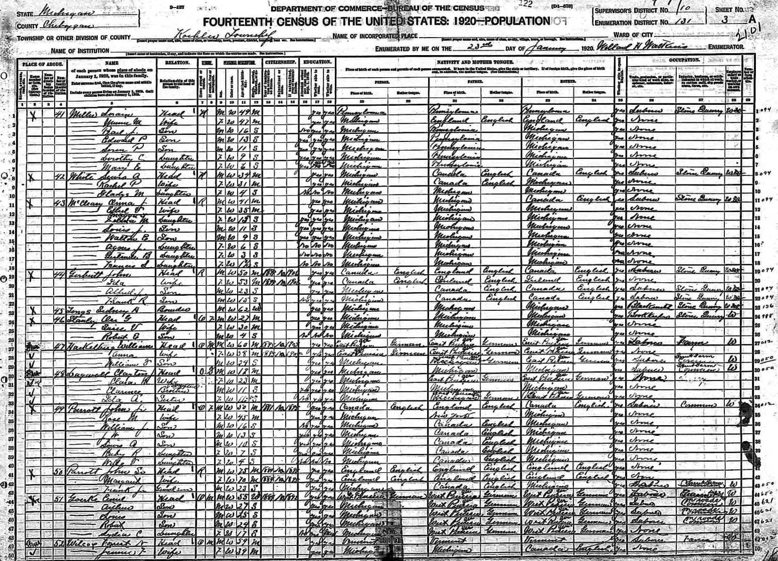 - U.S. Census 1920 shows this household in Koehler Township, Cheboygan County, Michigan:
