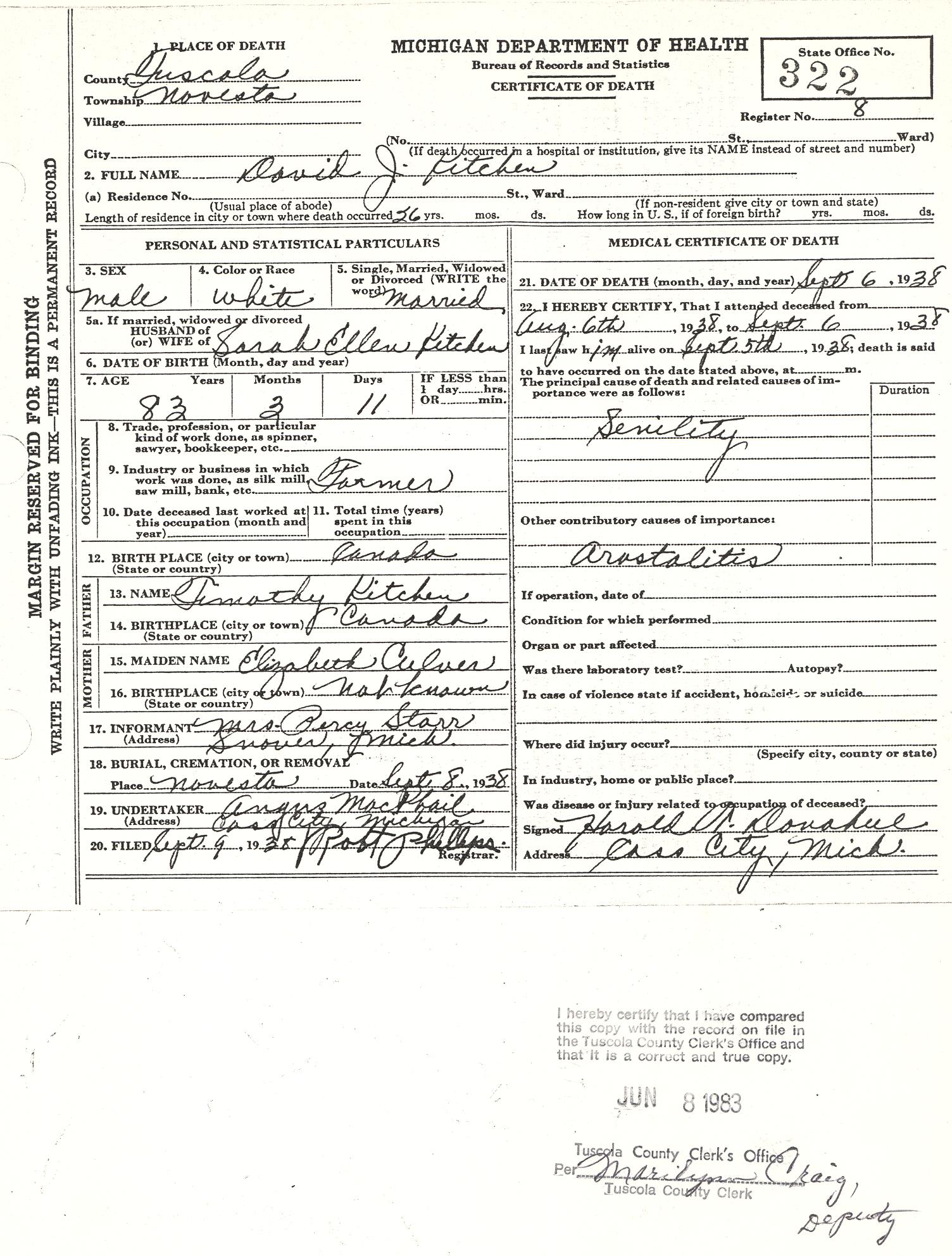 - Certified June 8, 1983 copy of Certificate of Death for