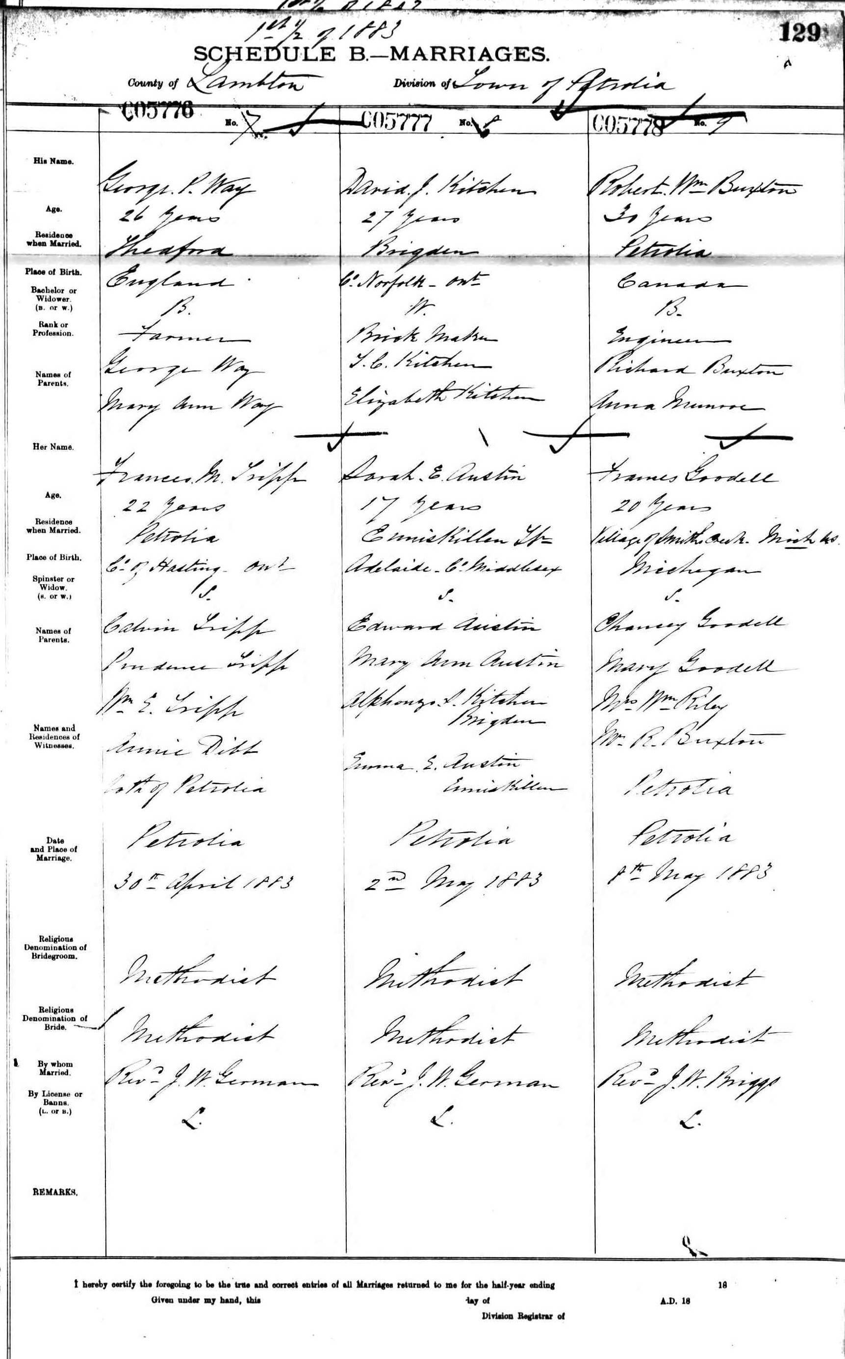 age 27, of Brigden, Ontario, born in Norfolk Co. Ontario, widower, a brickmaker, son of T.C. Kitchen and Elizabeth Kitchen, to Sarah E. Austin, age 17,