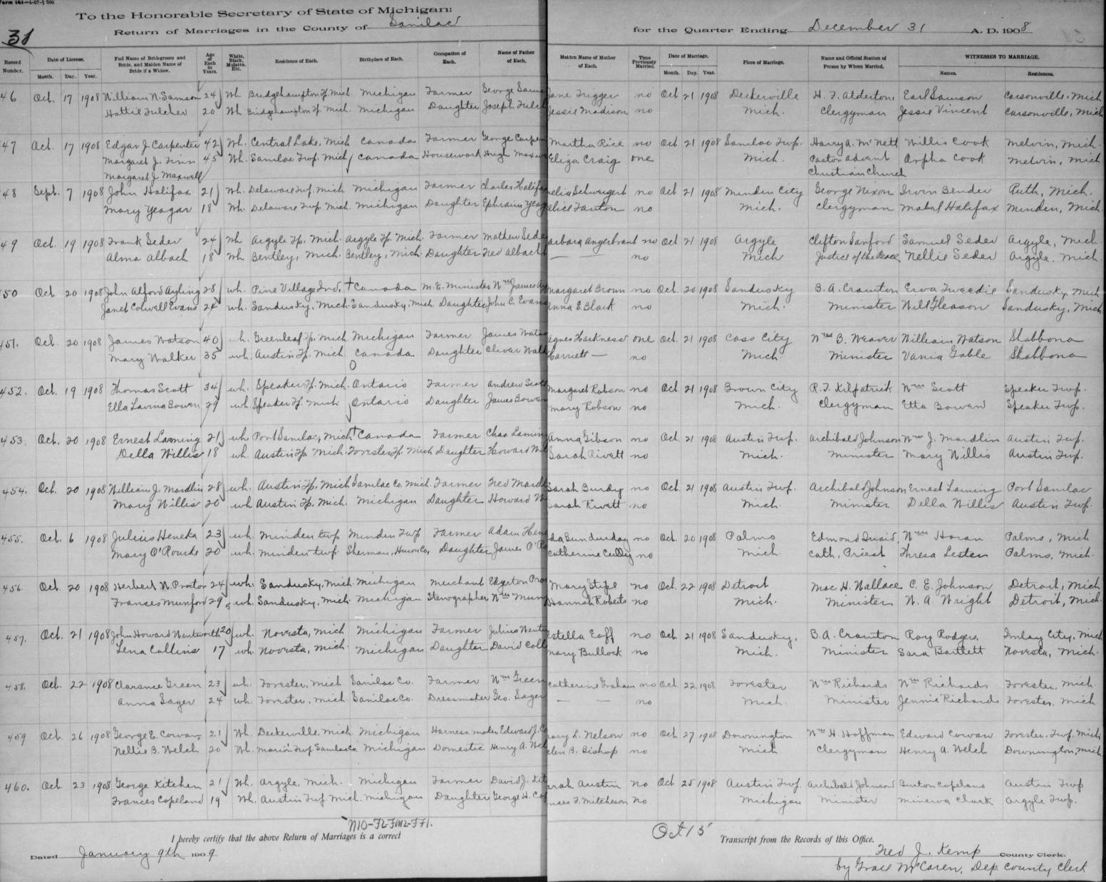 on 25 October 1908 at Austin Twp., Sanilac Co., Mich. of