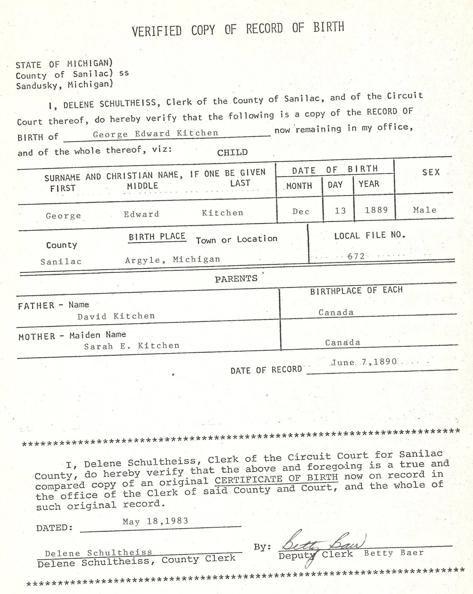 - Doris Kitchen (b. 7 Sep 1911, Argyle, Sanilac Co., Mich.; d. 20 Jan 1919)