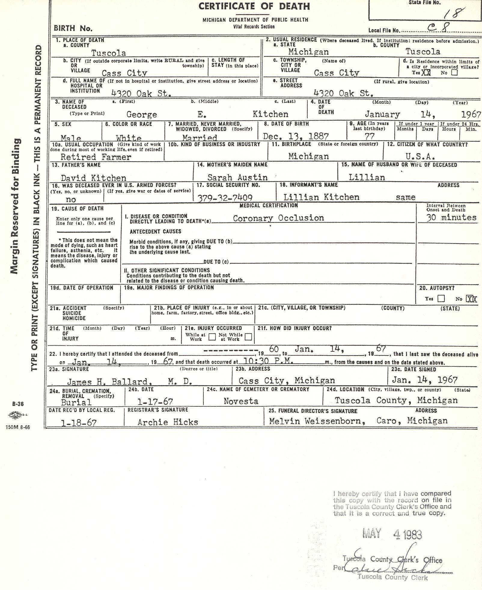 - d. 14 Jan 1967, Cass City, Tuscola Co., Mich.