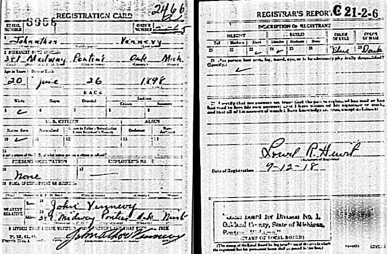 for Johnathon Venevy, born 26 June 1898, residing in Pontiac, Mich. He listed his nearest relative